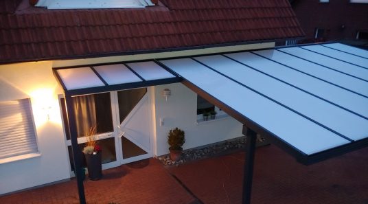 Entdecken Sie unsere Überdachungen mit klaren Stegplatten, die für hervorragende Lichtdurchlässigkeit und klare Sicht nach draußen sorgen. Diese bieten Schutz vor Witterungseinflüssen und schaffen einen lichtdurchfluteten Raum im Freien. Im Gegensatz dazu bieten unsere Überdachungen mit matten Stegplatten eine sanfte Lichtstreuung, Privatsphäre und eine gemütliche Atmosphäre, indem sie direkte Sonneneinstrahlung reduzieren und einen behaglichen Raum im Freien schaffen.